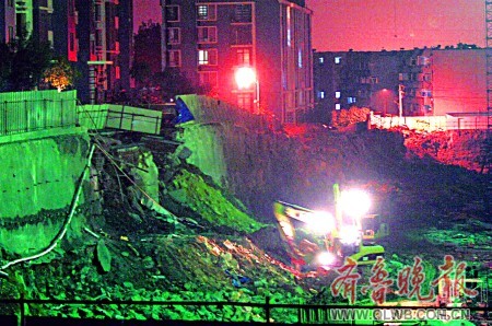 晚8點(diǎn)左右,記者趕到泉景天沅·秀園新建樓盤施工現(xiàn)場(chǎng),這處工地南側(cè)緊挨著王女士居住的樓房。地基已經(jīng)挖到十幾米深,如刀切斧剁一般齊刷刷到底,橫截面上有一些用來加固土層防止坍塌的錨桿。根據(jù)記者目測(cè),坍塌的地方長度約10米,土層從上到下一落到底(上圖)。為防止情況繼續(xù)惡化,施工方已經(jīng)采取了措施。兩輛渣土車正從挖出的土堆上往坍塌的地基處運(yùn)送土方,而兩臺(tái)挖掘機(jī)則把運(yùn)來的土方往坍塌處回填反壓。
