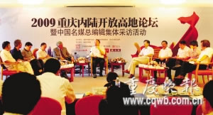 昨日,“2009內(nèi)陸開發(fā)高地論壇”在我市舉行,國內(nèi)十家知名媒體的總編輯應(yīng)邀到會(huì),他們包括了南方周末總編輯向熹、第一財(cái)經(jīng)日報(bào)總編輯秦朔、21世紀(jì)經(jīng)濟(jì)報(bào)道總編輯劉洲偉、中國新聞社社長劉北憲、新浪網(wǎng)總編陳彤、中國周刊執(zhí)行社長朱德付、新京報(bào)總編輯戴自更、新聞出版報(bào)社長姜軍等。老總們集體采訪了市委常委、常務(wù)副市長黃奇帆,請他闡釋“重慶怎樣才算建成內(nèi)陸開放高地”,黃奇帆回答說:“我個(gè)人認(rèn)為,將來重慶成了長江上游的經(jīng)濟(jì)中心、金融中心和貿(mào)易中心,內(nèi)陸開放高地就算建成了!