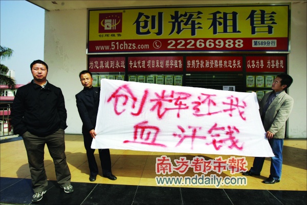 近20位客戶聞訊趕到創(chuàng)輝租售水云軒中山總店追討欠款。店員的統(tǒng)一答復(fù)是“追討欠款的業(yè)主請到深圳總部查詢”。該公司一名陳姓置業(yè)顧問表示,“我們最多虧一個月的工資,還承受得了。最慘的是客戶,有的人怕是一輩子攢下的錢都難指望了!