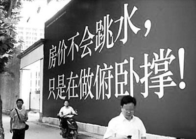 這種房產(chǎn)廣告,不禁讓人聯(lián)想起之前在南京中央大道推出的另一個(gè)巨幅樓盤廣告:“房價(jià)不會(huì)跳水,只是在做俯臥撐!倍咚悸啡绯鲆晦H,都是利用網(wǎng)絡(luò)熱門流行語來博出位、吸引眼球,從而達(dá)到促銷的目的。