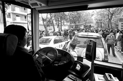 記者發(fā)現(xiàn),現(xiàn)場有9輛31路公交車被堵無法前行,公交司機們?nèi)齼蓛傻鼐墼诼愤吜奶。一名王姓司機說,他已被堵近1小時,但因車隊未允許調(diào)頭返隊,他只好原地等待。當被問及如何處理車上乘客時,他說,由于等待時間過長,乘客只能下車步行離開此地。