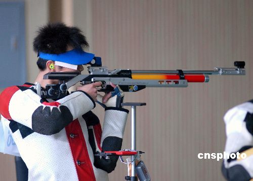 2007年10月26日,第六屆全國城市運(yùn)動(dòng)會(huì)“人保財(cái)險(xiǎn)”杯射擊比賽在武漢關(guān)山射擊培訓(xùn)中心鳴槍開賽。來自溫州市代表隊(duì)運(yùn)動(dòng)員朱啟南以703.7環(huán)的總成績,輕松奪得男子10米氣步槍60發(fā)決賽金牌,超過702.7環(huán)的世界紀(jì)錄和703.4環(huán)的全國紀(jì)錄;石家莊市代表隊(duì)運(yùn)動(dòng)員張強(qiáng)獲銀牌,杭州市代表隊(duì)運(yùn)動(dòng)員吳佳寧獲銅牌。中新社發(fā) 楚天行 攝