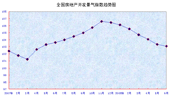 中新網(wǎng)7月18日電 據(jù)國(guó)家統(tǒng)計(jì)局網(wǎng)站消息,6月份,“國(guó)房景氣指數(shù)”為103.08,比5月份回落0.26點(diǎn),比去年同月回落0.55點(diǎn)。