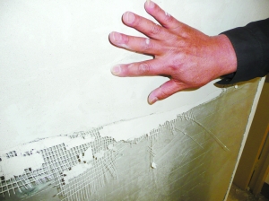 (記者吳昊亮)崇文區(qū)廣渠家園回遷樓,上百戶出現(xiàn)天花板漏水,施工方進(jìn)入居民家免費(fèi)維修(本報(bào)昨日?qǐng)?bào)道)。昨日,多家漏水住宅在整修時(shí)發(fā)現(xiàn)新隱患,有的從地面泛水,有的發(fā)現(xiàn)墻內(nèi)的網(wǎng)布不粘著保溫層,可整片扯脫。