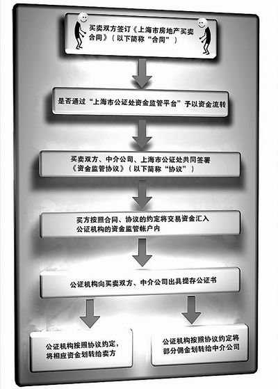 與上海市公證處從事的其他公證業(yè)務(wù)不同的是,二手房資金監(jiān)管過程中,公證處并非獨立第三方,而介入其中成為主體之一。據(jù)介紹,在資金打入公證處監(jiān)管賬戶之前,二手房上下家、中介公司和上海市公證處將簽定一份《資金監(jiān)管協(xié)議》。上海市公證處與上下家共擔整個交易過程中的資金風險。