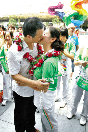 編號:20108161314。兩位新人從園區(qū)志愿者部部長夏科家手上接過了獨一無二的世博結(jié)婚證。這個編號不但是對他們婚禮吉時的記錄,也是對他們幸福生活的美好祝福!坝H一個!親一個!”圍在新人周圍的99位“小白菜”可不會輕易放過這位和自己朝夕相處的老師,開始起哄。大庭廣眾之下,施諾哪好意思,對著新娘的額頭就是一下蜻蜓點水,想要糊弄過關(guān)!安凰!不算!”聲音越來越響,不少游客也忍不住駐足觀望。迫于“群眾壓力”,兩人在七彩之心下深情一吻,接受所有人的祝福。