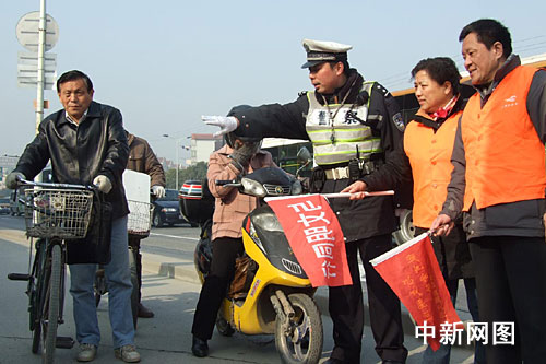 日前,在浦東盧浦大橋下的第一個叉路口、耀華路西營路路口,世博場館西大門的第一個交通崗,上鋼社區(qū)交通文明志愿者分別從浦東交警支隊三大隊教導員曹德勝和上鋼街道文明辦主任彭薇芬手中接過“爭創(chuàng)示范文明崗”的旗幟后,浦東世博區(qū)域警民攜手共同創(chuàng)建世博交通第一崗正式啟動。