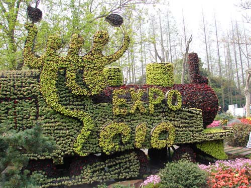4月8日,綠色植物打造的“海寶”、“世博火車頭”,竹子、藤條編織出的城市文明志愿者——小螞蟻“小志”,還有在鮮花掩映下的“中國(guó)館”……這些濃郁的世博元素為近日的上;ㄕ乖鎏砹瞬簧倭辽。