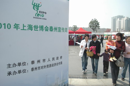 為了讓更多的泰州市民和企業(yè)“了解世博、支持世博、貢獻(xiàn)世博、共享世博”,江蘇省泰州市政府和上海世博局于4月6日至12日分別在溱湖國(guó)家濕地公園和位于鬧市區(qū)的濱河廣場(chǎng)開(kāi)展了“2010年上海世博會(huì)泰州宣傳周”活動(dòng)。