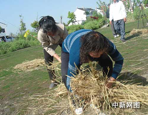 連日來(lái),上海市及各區(qū)縣紛紛舉行各種形式的慶;顒(dòng),迎接二0一0年上海世博會(huì)開(kāi)幕倒計(jì)時(shí)一周年。在今天下午的廊下鎮(zhèn)記者看到,一個(gè)多由農(nóng)民參加,頗有江南鄉(xiāng)村特色的體育節(jié)拉開(kāi)了帷幕。據(jù)主辦方介紹,這個(gè)名為“健康迎世博”的廊下鎮(zhèn)第二屆鄉(xiāng)村體育節(jié),旨在表達(dá)當(dāng)?shù)剞r(nóng)民希望通過(guò)體育運(yùn)動(dòng)來(lái)迎接世博會(huì)開(kāi)幕的心情,同時(shí)也為“五一”假期里來(lái)此郊游的滬上市民提供一個(gè)參與鄉(xiāng)村游戲的舞臺(tái)。將持續(xù)至5月3日的本屆鄉(xiāng)村體育節(jié),設(shè)立的十個(gè)體育游戲項(xiàng)目,多是從日常的農(nóng)活中提煉而來(lái)的,包括捆稻草、插秧、搓跳繩、搶在暴風(fēng)雨前、拋接米袋和運(yùn)磚造房子等,充滿了鄉(xiāng)村野趣。
