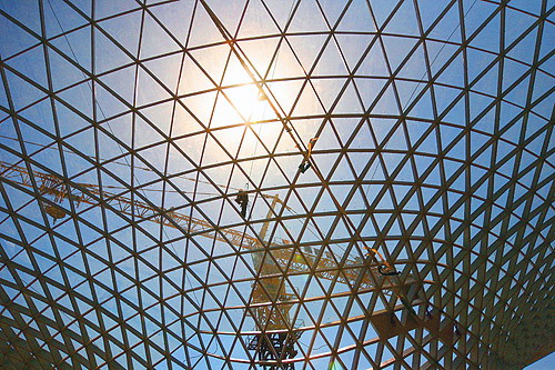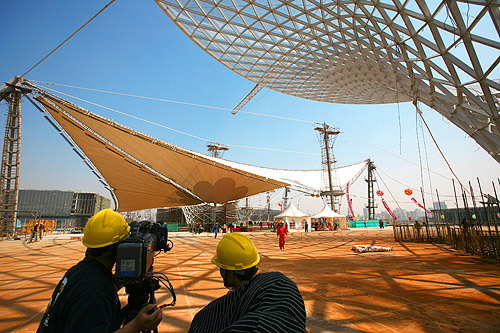 中新網(wǎng)4月30日電 據(jù)上海世博會(huì)官方網(wǎng)站消息,今天,世博軸上首批兩個(gè)喇叭狀的陽光谷正式落成,同時(shí)頂棚膜結(jié)構(gòu)張拉啟動(dòng),這標(biāo)志著世博軸上部主體工程即將全面完工。上海世博會(huì)執(zhí)委會(huì)專職副主任鐘燕群、上海世博局副局長(zhǎng)丁浩等出席儀式。鐘燕群宣布啟動(dòng)世博軸頂棚膜結(jié)構(gòu)張拉。