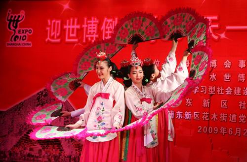 6月27日下午,上海市浦東新區(qū)花木社區(qū)文化活動中心熱鬧非凡,熱烈的掌聲和歡快的音樂聲不時地響起,由上海世博局和2012年韓國麗水世博會組委會聯(lián)合主辦、上海市學(xué)習(xí)型社會建設(shè)服務(wù)指導(dǎo)中心和浦東新區(qū)社區(qū)學(xué)院協(xié)辦的“迎世博倒計時300天——中韓民眾社區(qū)大聯(lián)歡”活動正在這里舉行。麗水世博會組委會秘書長金丙一、韓國駐滬副總領(lǐng)事延上模、上海世博局副局長朱詠雷、上海市學(xué)習(xí)型社會建設(shè)服務(wù)指導(dǎo)中心副主任王連華等出席活動。