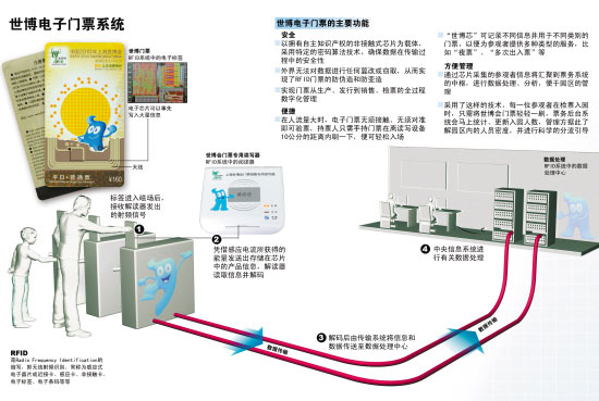 ●上海世博會會期半年,預計可吸引全世界7000萬人次的參觀者,其票務系統(tǒng)被稱為有史以來最大規(guī)模的電子標簽門票應用案例。