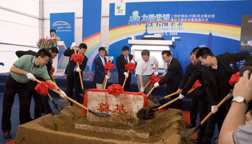 奠基儀式上,阿里巴巴董事局主席馬云代表民企館組委會與上海世博局局長洪浩互贈禮物。雙方分別贈送的是象征中國精神的上海世博會中國館模型和寓意中國民企“鼎力助世博 活力創(chuàng)未來”的琉璃鼎。