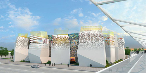以“新俄羅斯:城市與人”為主題的俄羅斯館由12個塔樓和“懸浮在空中”的立方體組成,外形設(shè)計類似古代斯拉夫人的小村落,象征著生命之花、太陽以及世界樹(斯拉夫人枝葉繁茂的橡樹)的根。塔樓由白、金、紅三種顏色構(gòu)成,白色和金色塑造了俄羅斯建筑的歷史形象,而紅色底色加上富有俄羅斯各民族元素的圖案,則賦予了塔樓頂部鏤空部分以生命力。