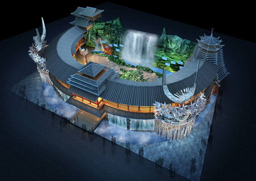 貴州館平均高度為7.2米,極端高度達(dá)8.5米,展示主題為“醉•美貴州,避暑天堂”。在600平方米的展示面積中,將貴州的自然山水和多元民俗文化巧妙結(jié)合,抽取風(fēng)雨橋、鼓樓、苗寨、銀飾和山水瀑布極具貴州特色的視覺元素,高度凝煉貴州人文自然風(fēng)貌以及“醉•美”和“避暑”的特色。強烈的視覺沖擊力和民俗特色,力求使絕大多數(shù)不了解貴州或從未踏足過貴州的參觀者,也能在第一時間內(nèi)對貴州館留下深刻的印象。