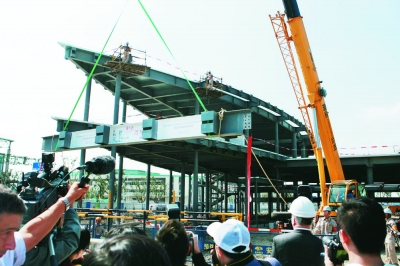 一邊籌資一邊建館的美國館,直到今年7月份才遲遲開工,雖然在參展資金上有些捉襟見肘,但其6000平方米的占地面積仍然是所有外國自建館中最大的之一。讓人吃驚的是,美國館僅用了兩個(gè)多月的時(shí)間,就完成了總體結(jié)構(gòu)封頂(見上圖),可謂是后來居上。在建設(shè)工期上取得如此效率,和上海方面的積極配合協(xié)作是分不開的。14日下午,新任美國駐華大使親臨世博園,參加了美國館的封頂儀式。