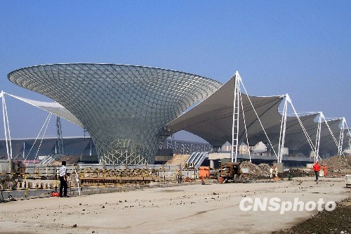 世博軸工程將于2009年底竣工。世博軸設(shè)計獨具匠心,既有引陽光入地下,減少照明能耗的巨大杯狀陽光谷,也有為參觀者遮陽擋雨、綿延輕透的世界最大索膜結(jié)構(gòu),這些鮮明特征使世博軸成為上海世博會的一大標(biāo)志。世博軸是2010年上海世博會的主入口、中央安檢通道和人行立體交通、服務(wù)樞紐。圖為11月26日拍攝的藍(lán)天下的上海浦東世博園區(qū)的世博軸工地。中新社發(fā) 周東潮 攝