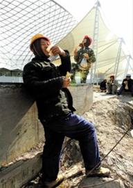 沒(méi)有老資歷的工人,卻意外遇到位老資歷的小販。世博軸邊上,在工地賣(mài)燒酒的葛師傅告訴記者,他做工人們的生意,已經(jīng)快滿三年了……