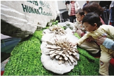 “在湘西瀘溪縣一座半山腰上偶遇而得來的,這是緣分!本栈ㄊ窦妓噦鞒腥、高級工藝美術師于智勇介紹,為讓湖南菊花石重現(xiàn)世博會,省工藝美術研究所在兩年前就開始尋覓大型菊花石,足跡踏遍了湖南的山山水水,“菊花石找到不少,但是很多不理想。”