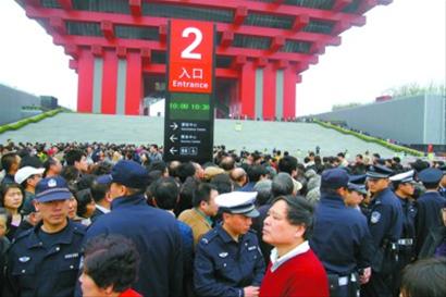 上午10點,由于人流過于擁擠,亞洲廣場旁的預約點預約機陷入癱瘓,全面停止了預約。工作人員在現(xiàn)場用擴音機與排隊的參觀者隔空喊話,大約10多分鐘后,人潮漸漸散去。對于這個突發(fā)的情況,預約點的工作人員表示,希望參觀者可以自行分流,雖然有些預約點的地理位置離中國館相對較遠,但每張預約券都預留了至少1個小時的提前量,如果9點打印的預約券,上面的預約時間至少是10點以后,因此,無論在展區(qū)的任何一個預約點預約,走到中國館參觀都是來得及的。