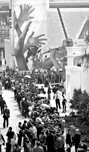 拿到中國(guó)館預(yù)約券的游客欣喜,沒拿到的也十分平和。錢先生夫婦9時(shí)45分入園時(shí),中國(guó)館預(yù)約券已發(fā)放完畢,他們就在亞洲廣場(chǎng)上的預(yù)約機(jī)上預(yù)約了主題館的參觀!爸袊(guó)館反正是永久性建筑,以后再來看也不遲,”同樣未能拿到預(yù)約券的李先生告訴記者。
