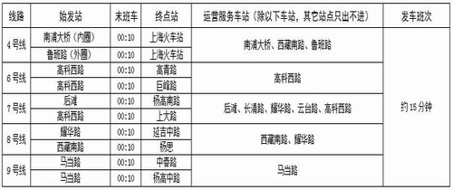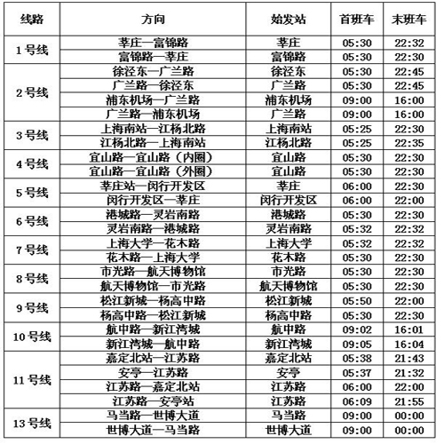 軌道交通4、6、7、8、9五條涉博線路在常規(guī)末班車后,將在世博園周邊站點(diǎn)加開加班列車,除重點(diǎn)涉博車站以外,其他途經(jīng)車站只可下客出站,不可進(jìn)站上客和換乘。加開列車末班車時(shí)間為0:10,運(yùn)營間隔約為15分鐘一班。具體車站的首末班車時(shí)間還可查看各車站公告、至上海地鐵官網(wǎng)(/) 進(jìn)行查詢或撥打地鐵服務(wù)熱線64370000進(jìn)行詢問。