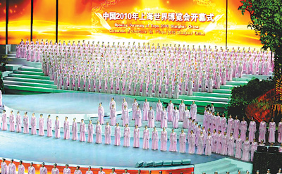 當(dāng)700位少女吟詠出天籟之音的一刻,8000多人的上海世博文化中心一片靜寂;當(dāng)漫天焰火釋放出億萬(wàn)人激情的時(shí)候,黃浦江兩岸又轉(zhuǎn)而熱血沸騰。一靜一動(dòng),室內(nèi)室外,陸地江面,天空大地,讓世博會(huì)開幕式形成天地合一的整體。