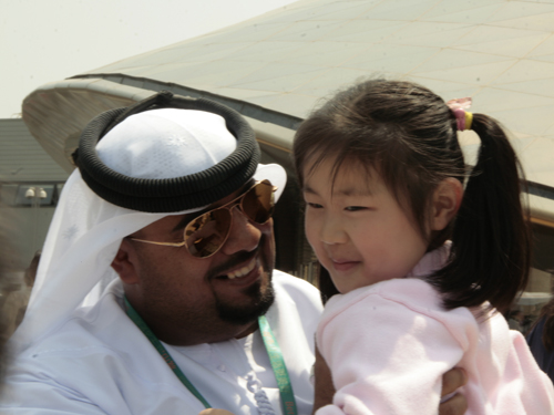 為了緩等待人群的焦急,阿聯(lián)酋館的工作人員還和游客互動(dòng),抱起了人群中的一個(gè)小女孩合照,讓周圍游客開懷不已。