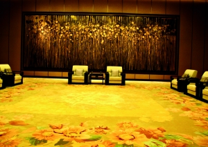 中國館60.6米層正中為金廳,在五行中,土居中,土色黃,黃色高級(jí)的境界是金,故此廳定位金色,主題以展示向日葵為主。