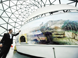 進(jìn)館后,必經(jīng)一段弧形走廊,約30米長,通向環(huán)形劇院。那是第二個(gè)體驗(yàn)區(qū)“光之廳”,被透明玻璃覆蓋,任憑陽光肆意傾灑。
