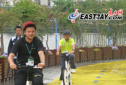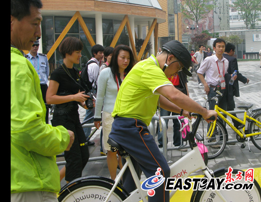 黃綠色的李寧運(yùn)動(dòng)短T,深色的李寧網(wǎng)球褲,白色的李寧運(yùn)動(dòng)鞋,再加一頂黑色的李寧鴨舌帽,今天上午10點(diǎn)半左右,在各路記者的簇?fù)硐拢羧阵w操王子李寧出現(xiàn)在世博會浦西城市最佳實(shí)踐區(qū),從馬德里案例區(qū)出來后,出現(xiàn)在了歐登塞展區(qū),看著路邊停放著的一整排自行車,李寧也過了一把騎車癮,引起了游客的圍觀。