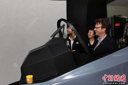 來(lái)到大型飛機(jī)模擬機(jī)展區(qū),大山嫻熟地坐進(jìn)駕駛艙體驗(yàn)飛行。“那是浦東、這是陸家嘴!彼贿叢倏v模擬機(jī),一邊辨認(rèn)著大屏幕上出現(xiàn)的地面標(biāo)志性建筑物。大山對(duì)環(huán)形屏幕中顯示的上海非常熟悉,認(rèn)出了很多地點(diǎn),并笑稱(chēng)要從世博會(huì)加拿大館上空飛過(guò)。走下駕駛艙,大山幽默地稱(chēng)自己有點(diǎn)快學(xué)會(huì)開(kāi)飛機(jī)了。