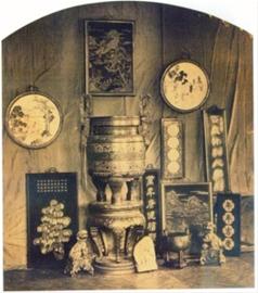 史料記載,1862年世博會(huì)上中國(guó)的參展規(guī)模很小,沒(méi)有單獨(dú)的展館,只是在主展廳內(nèi)有一個(gè)小小的展區(qū)展出一些陶瓷等中國(guó)土特產(chǎn)。照片印證了這一點(diǎn)。中國(guó)展示的有瓷器、佛像、琺瑯器、寶塔等,還有一張巨幅祖宗油畫(huà)。沒(méi)有獨(dú)立展館,但一個(gè)外國(guó)孩童正定睛觀看展品,初步顯示了東方藝術(shù)獨(dú)特魅力。