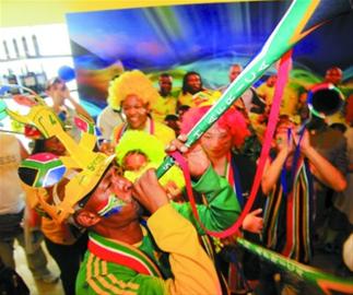 雖然開幕式要到20∶00才開始,但在19∶00不到的時(shí)候,南非館的門口和館內(nèi)就已經(jīng)喧鬧無比,受邀參加南非館世界杯開幕慶典的嘉賓,幾乎人手一個(gè)VUVUZELA,頭戴“馬卡若卡”(一種南非特色帽子,外觀像足球)。南非球迷的脖子上還掛著印有南非國旗的圍巾,臉上或手臂上也彩繪著南非國旗。
