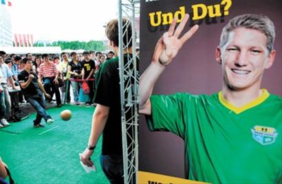 南非館前的籠式足球游戲成為園區(qū)最熱門(mén)的互動(dòng)項(xiàng)目之一。雖然獎(jiǎng)品只是世界杯紀(jì)念水壺,可球迷們都表示不是沖著獎(jiǎng)品去的,幾小時(shí)內(nèi)數(shù)百人在鐵籠中大秀腳法。期間,也有外國(guó)游客躍躍欲試。一名叫卡爾的德國(guó)男子看到足球就來(lái)勁,上前擺出的架勢(shì)頗為專業(yè),最后還是三次全部踢偏。