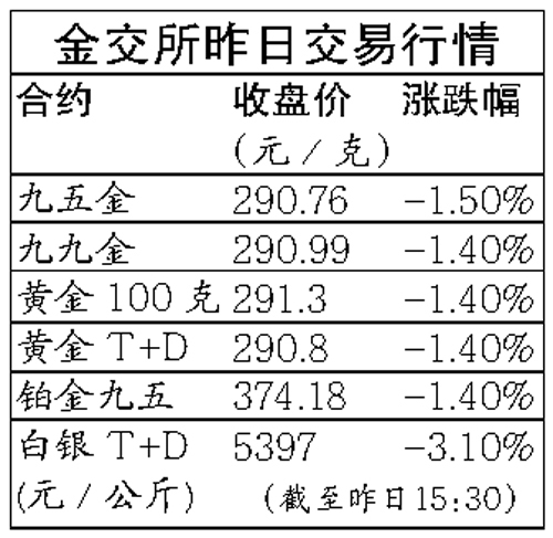 金價(jià)從上周五開始“四連跳”,受此影響,昨日國(guó)內(nèi)金價(jià)也震蕩收低,跌幅達(dá)1.44%。