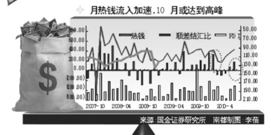 對熱錢推動(dòng)的流動(dòng)性充沛可以持續(xù)多久的問題,國金證券分析認(rèn)為,“全球流動(dòng)性充沛正成為中期問題。地產(chǎn)調(diào)控、升值預(yù)期的明確以及美元趨勢、熱錢的監(jiān)管加強(qiáng)使得熱錢流入速度在10月達(dá)到高峰后趨于緩和。”國內(nèi)的熱錢流入成為短期內(nèi)無法拒之門外的中期問題。預(yù)計(jì)11月份熱錢流入的增長速度將轉(zhuǎn)緩,但是流動(dòng)性數(shù)量的轉(zhuǎn)折至少要到2011年2季度才能看到。