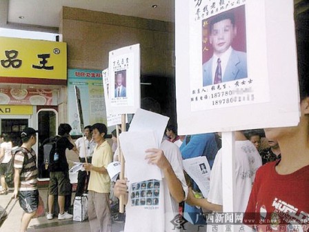 由于自己投資了1000萬元跟南寧市某房地產公司合作開發(fā)一個小區(qū),但該公司的法人鄭某竟將上億資金卷走,當事人經過幾年的尋找卻找不到鄭某。昨日,柳州市國泰房產開發(fā)有限責任公司法人陳健美采取“非常手段”,帶著公司員工和親戚來到南寧市火車站、朝陽廣場、萬達廣場等繁華地帶,舉著鄭某的照片,懸賞1萬元,“尋找南寧最大的老賴”,此舉吸引了不少市民的眼球。