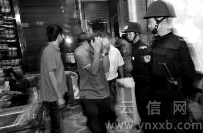 “緊急通知,今晚九點半在分局集中,參加統(tǒng)一行動!蓖21時左右,官渡公安分局治安大隊民警們突然接到了臨時通知。22時,內(nèi)線發(fā)出信號,警車開往珥季路某娛樂會所。當(dāng)50多名全副武裝的警察沖進(jìn)該娛樂場所時,訓(xùn)練有素的迎賓們并沒有慌亂,漂亮的姑娘們依舊招牌式笑著:“歡迎光臨”。