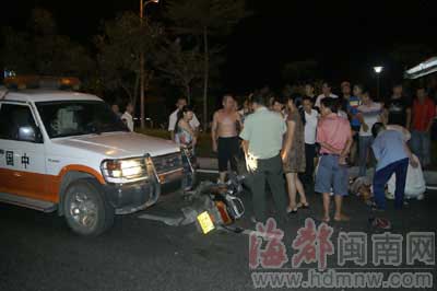 事發(fā)8月17日晚近10時,黃先生說:“太突然了,我一下被撞飛,當(dāng)時馬上暈過去了。”當(dāng)晚,他和幾個同事在江濱路大排檔吃完飯后,分乘兩輛摩托車沿江濱路由東往西行駛,他開的摩托車上載著同事周女士。途經(jīng)洋老洲游泳池附近時,黃先生突然感到后面有車撞來,他和周女士被撞倒并被往前面推行了10多米,接著他就暈過去了。
