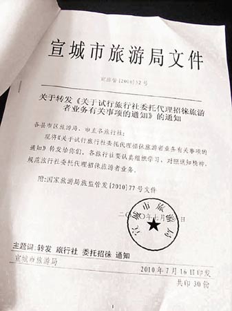 記者向當?shù)芈糜螛I(yè)界人士了解了一些情況,據(jù)說整個宣城市,包括涇縣在內(nèi),沒有一家旅行社具備組織出境游的資格。當?shù)芈眯猩缱疃酁楹戏、南京等地旅行社做代理攬客的業(yè)務。