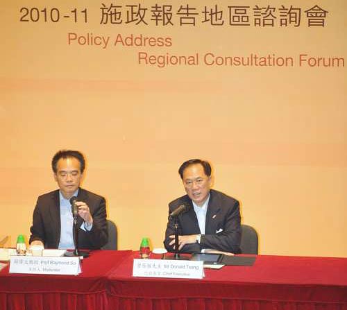 特區(qū)政府已分批約見(jiàn)多個(gè)政黨和團(tuán)體,咨詢(xún)市民對(duì)施政報(bào)告的意見(jiàn)。首場(chǎng)咨詢(xún)會(huì)在科學(xué)館舉行,約有來(lái)自各區(qū)200名市民出席,但只有十多人向曾蔭權(quán)提問(wèn),大部人均關(guān)注民生議題,包括復(fù)建居屋的訴求。曾蔭權(quán)在開(kāi)場(chǎng)白中表示,希望透過(guò)咨詢(xún)會(huì)聆聽(tīng)大家在生活、學(xué)習(xí)、就業(yè)、營(yíng)商等各方面的意見(jiàn)、憂(yōu)慮和建議。他將在一周后動(dòng)筆,希望在下月13日發(fā)表的《施政報(bào)告》能夠反映出各方面的意見(jiàn)。