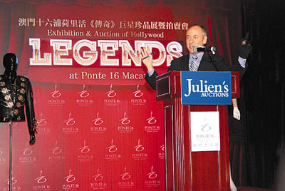 中新網(wǎng)10月12日電 據(jù)香港文匯報(bào)報(bào)道,澳門(mén)十六浦荷里活《傳奇》巨星拍賣(mài)會(huì)日前舉行。這是朱利安拍賣(mài)行于亞洲舉行的首個(gè)拍賣(mài)會(huì),吸引了來(lái)自世界各地的競(jìng)投家及收藏家參與,歷時(shí)11小時(shí)的拍賣(mài)會(huì),成功拍賣(mài)共435件珍品,總成交價(jià)高達(dá)320萬(wàn)美元,其中邁克爾·杰克遜的手套更是賣(mài)出21萬(wàn)美元的高價(jià)。