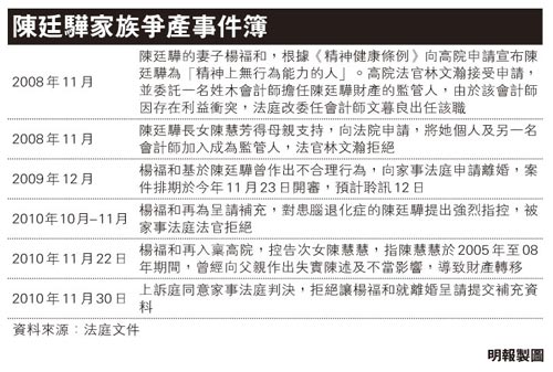 知情人士透露,陳慧芳于2008年回港后,即使與胞妹陳慧慧交惡,各人也極為緊張父親的名聲,上周楊福和控告次女,已經(jīng)令家族不和消息甚囂塵上,如今再以不合理行為申請(qǐng)離婚,對(duì)年老又患病的陳廷驊的聲譽(yù)影響更大。