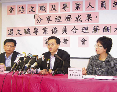 工聯(lián)會(huì)屬會(huì)香港文職及專業(yè)人員總會(huì)權(quán)益委員會(huì)在去年9至11月,成功訪問(wèn)735名會(huì)員,包括銀行、證券、保險(xiǎn)、會(huì)計(jì)、教育等從業(yè)人員,結(jié)果發(fā)現(xiàn):60%人去年獲加薪,另有分別33.3%、22.4%和21%受訪者說(shuō),會(huì)因“薪酬缺乏吸引力”、“同工不同酬”和“工時(shí)越來(lái)越長(zhǎng)”而考慮轉(zhuǎn)行或轉(zhuǎn)工,大多人表示會(huì)考慮投身金融界,如證券、銀行、地產(chǎn)、會(huì)計(jì)等。