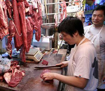 “資料圖:2007年8月23日”香港五豐行決定再調(diào)高活牛批發(fā)價后,2007年8月23日,有街市肉檔將零售價調(diào)高10%,但來貨量仍然緊張。據(jù)鮮肉大聯(lián)盟主席文灼培當日表示,五豐行只有38只內(nèi)地活牛到港。 中新社發(fā) 譚達明 攝