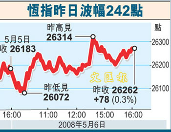 中新網(wǎng)5月7日電 據(jù)香港文匯報報道,港股繼續(xù)牛皮發(fā)展,恒指全日收報26262點,升78點,成交總額進一步縮減至702.7億元。證券經(jīng)紀表示,成交再萎縮,顯示市場買盤乏力,指數(shù)上升只是中移動獨撐大市而已,而且人為因素甚強,相信若內(nèi)地或美國一旦有壞消息出臺,恒指將下試25000點支持位。
