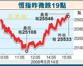 中新網(wǎng)5月15日電 據(jù)香港文匯報報道,港股14日早在缺乏利好消息、加上獲利盤涌現(xiàn)下,曾跌逾400點,但在午后內(nèi)地股市彈升帶動下,跌幅顯著收窄。A股升近3%,令港股低位反彈400點,恒指全日收報25533點,只跌19點,成交萎縮至682億元,是近3個月以來最低。