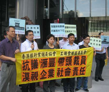 匯豐裁減人手,香港工會立即發(fā)起抗議。工聯(lián)會26日聯(lián)同香港銀行業(yè)雇員協(xié)會十名會員,到中環(huán)匯豐銀行總行抗議,不滿匯豐銀行“帶頭”裁員,不體恤員工的壓力和辛苦,其后匯豐銀行派人接收請愿信。